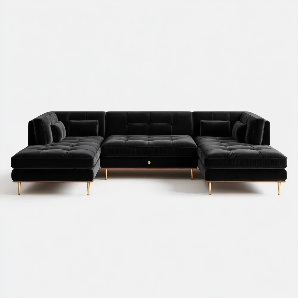 高品質のベルベット素材を使用し、ブラックカラーで仕上げられたこのソファは、豪華で魅力的な外観を持っています。耐久性と質感を追求した一品です。