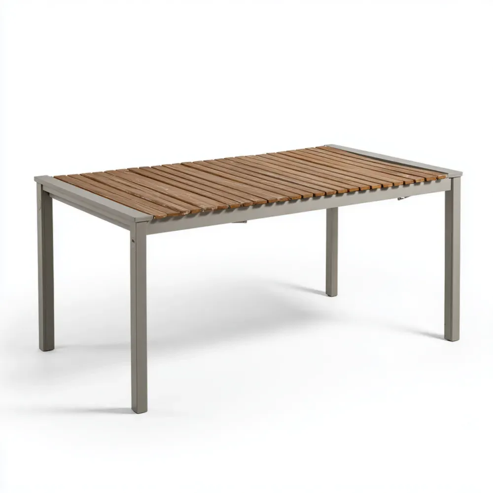 耐久性のあるアルミニウムフレームと、ナチュラルブラウンの木製テーブルトップが調和しています。